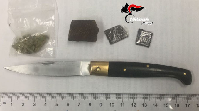 Denunciato un 14enne di Marano di Napoli che, sottoposto a controllo nella fermata metro in compagnia di altri 2 minori, è stato trovato in possesso di un coltello a serramanico della lunghezza di 16 cm. e di 7 grammi di hashish e 1 di marijuana detenuti per uso personale, motivo per il quale è stato segnalato al prefetto.