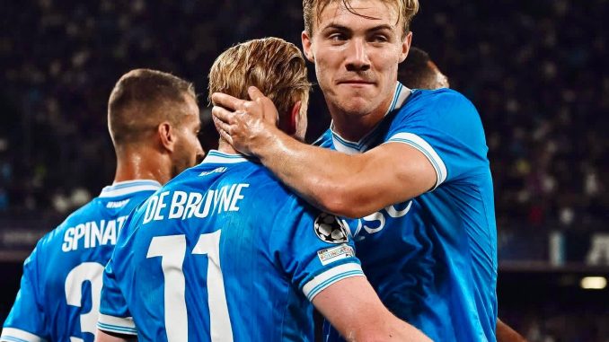 NAPOLI – La notte del “Maradona” ha il volto di Rasmus Højlund e i piedi fatati di Kevin De Bruyne. Il danese segna due volte, il belga inventa calcio e regala assist. Alla fine il Napoli piega lo Sporting Lisbona 2-1, soffrendo ma trovando la prima vittoria stagionale in Champions League.