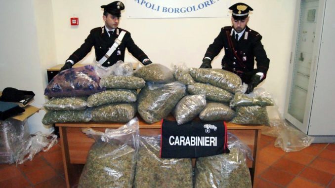 Perquisendo uno stabile residenziale in Zona Mercato i Carabinieri della Stazione di Borgoloreto hanno rinvenuto nel ripostiglio di un appartamento, nascoste in diversi scatoloni, 20 buste di cellophane contenenti complessivamente 55 chili di marijuana. Frazionati in dosi, ne avrebbero fruttate circa 45mila.