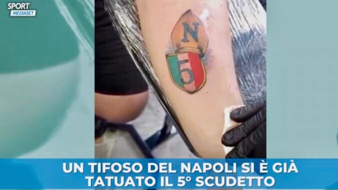 NAPOLI – A Napoli la passione per il calcio non conosce limiti, e nemmeno la scaramanzia. Un tifoso azzurro ha deciso di tatuarsi il simbolo del quinto scudetto, ancor prima che venga conquistato sul campo. Un gesto audace che ha fatto il giro del web, suscitando stupore e curiosità.