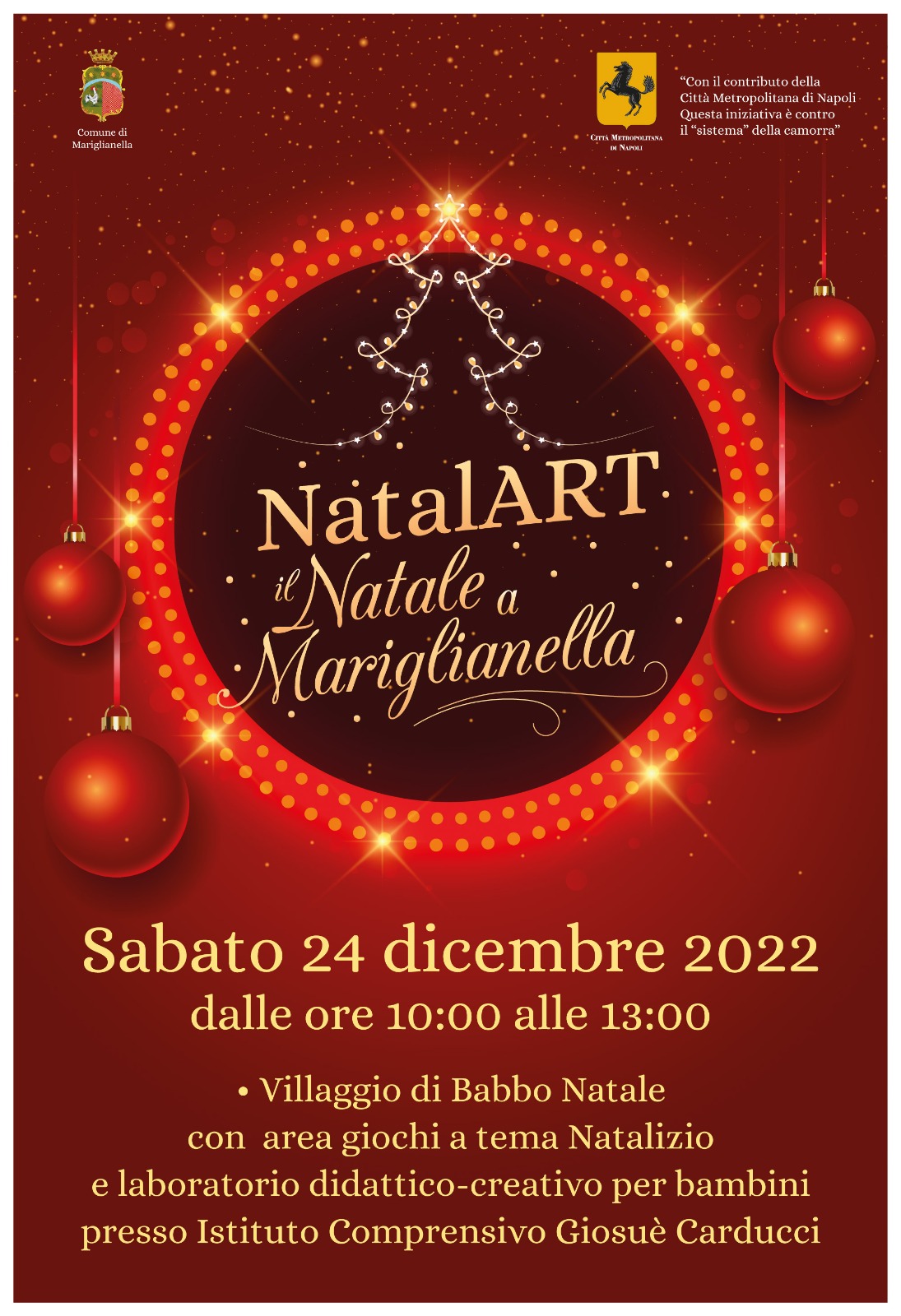 Sabato 24 dicembre, a Mariglianella arriva NatalART. Presso la palestra dell’IC Carucci di Mariglianella, dalle 10,00 alle 13,00, tutti i bambini e le loro famiglie potranno vivere la magia del Villaggio di Babbo Natale, con giochi gonfiabili, spettacoli di magia, musica e animazione. Per tutti ci sarà anche la possibilità di partecipare ad un laboratorio creativo a tema natalizio. La partecipazione è gratuita. Vi aspettiamo.