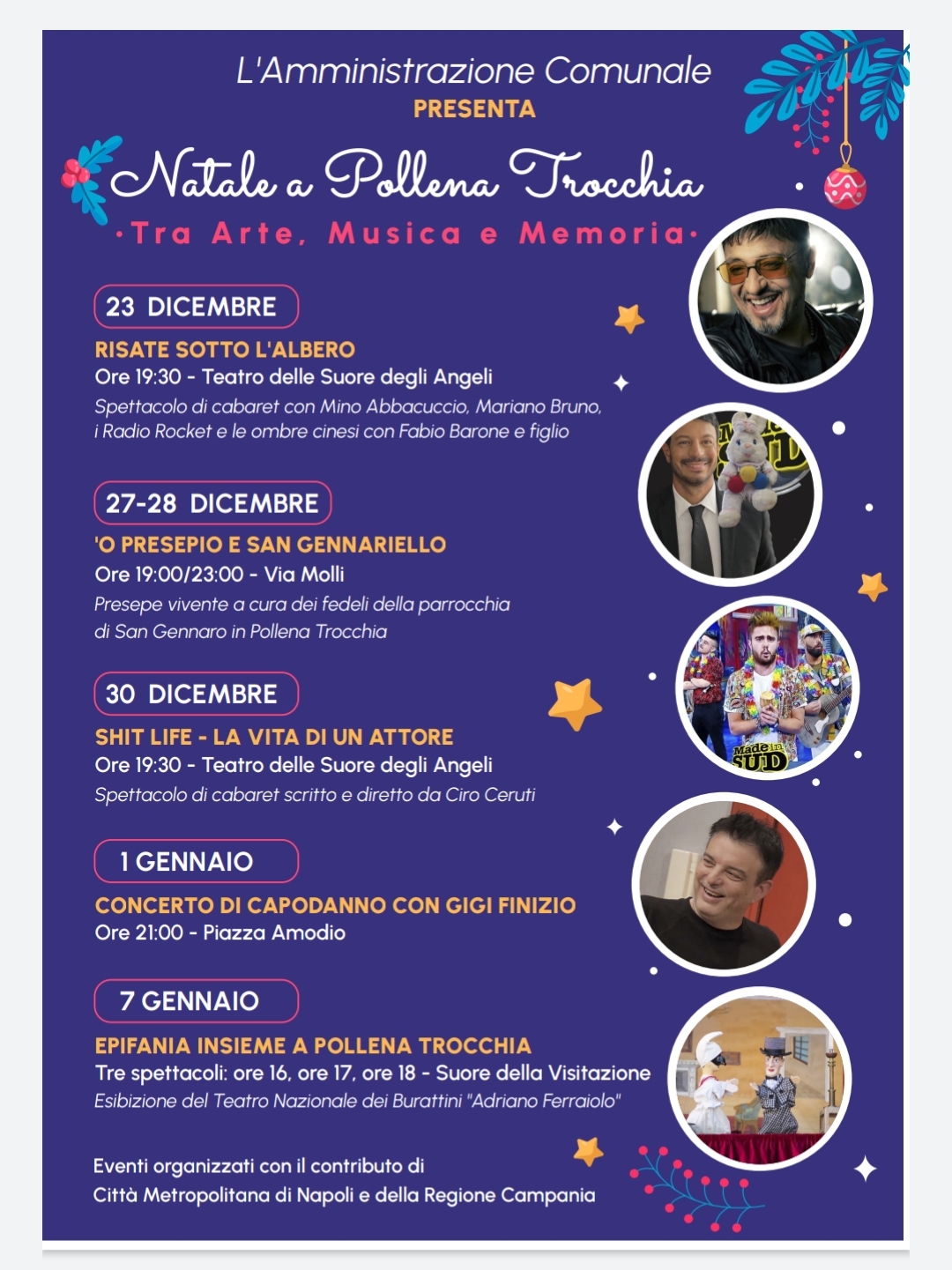 Spettacoli di cabaret, un concerto dal vivo, esibizioni del Teatro dei burattini e l’immancabile presepe vivente. È ricco ed articolato il cartellone degli eventi natalizi in programma a Pollena Trocchia dal 23 dicembre fino al prossimo 7 gennaio. Si comincia il giorno prima della vigilia di Natale all’insegna della comicità con lo spettacolo di cabaret dal titolo “Risate sotto l’albero”: l’appuntamento è alle ore 19:30 presso il Teatro Suore degli Angeli in Piazza Amodio con Mino Abbacuccio, Mariano Bruno, i Radio Rocket e le ombre cinesi con Fabio Barone e figlio. Si prosegue il 27 e 28 dicembre con la due-giorni dedicata a “O presepio e San Gennariello”, ricostruzione della santa natività a cura dei fedeli della parrocchia di San Gennaro in Pollena Trocchia. Appuntamento in questo caso dalle 19 alle 23 in via Molli. Il 30 dicembre sarà poi la volta di “Shit Life – La vita di un attore” alle ore 19:30 presso il Teatro Suore degli Angeli: uno spettacolo di cabaret scritto e diretto da Ciro Ceruti. Il primo giorno del 2023, invece, grande apertura dell’anno a Pollena Trocchia con il concerto di capodanno di Gigi Finizio a partire dalle ore 21 in Piazza Amodio. Il 7 gennaio, infine, “Epifania insieme a Pollena Trocchia”, con tre esibizioni – alle ore 16, 17 e 18 – del teatro nazionale dei burattini “Adriano Ferraiolo” presso le Suore della Visitazione. «Questa Amministrazione ha lavorato per dare spazio nel periodo natalizio ad eventi di varia natura, capaci di coinvolgere l’intera cittadinanza e andare incontro al gusto di tutti. C’è spazio per la tradizione, con il presepe vivente, per la comicità, con gli spettacoli di cabaret, per i più piccoli, con i burattini, e per gli amanti della buona musica con il concerto di Gigi Finizio» ha detto l’assessore Carmen Filosa. «Come Comune, in vista delle festività di fine anno, ci siamo attivati da tempo per recuperare risorse che ci consentissero di allietare questo periodo dell’anno ai nostri concittadini senza però gravare sulle casse municipali. Grazie al nostro lavoro il Comune di Pollena Trocchia è risultato beneficiario di due diversi finanziamenti, uno della Città Metropolitana di Napoli e l’altro della Regione Campania, che abbiamo subito tradotto in iniziative tangibili pensate per tutta la cittadinanza» ha aggiunto l’assessore al bilancio e vicesindaco Francesco Pinto. «Pollena Trocchia si appresta a vivere un grande Natale. Attraverso gli eventi messi in programma e grazie anche alle luminarie istallate su tutto il territorio sempre grazie a risorse sovracomunali, la comunità cittadina vivrà numerosi momenti di socialità e condivisione, che faranno respirare a grandi e piccoli la magia natalizia, contribuendo di certo a regalare quella serenità e quella gioia che a causa dei tempi difficili che attraversiamo sono ancor più preziose e necessarie» ha concluso il sindaco di Pollena Trocchia Carlo Esposito.