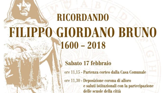 “Da sempre il 17 febbraio è il giorno del ricordo e della commemorazione – spiega l’assessore Cinzia Trinchese – Che Bruno sia da esempio alle nuove generazioni per il modello di vita che condusse incentrato sui valori del pensiero libero e che, nei giovani nolani, trova la sua massima espressione nel certame, il concorso filosofico ispirato ai suoi scritti in programma quest’anno dal 13 al 15 aprile. ‘La cena delle ceneri’, l’opera scelta per l’edizione 2018”.