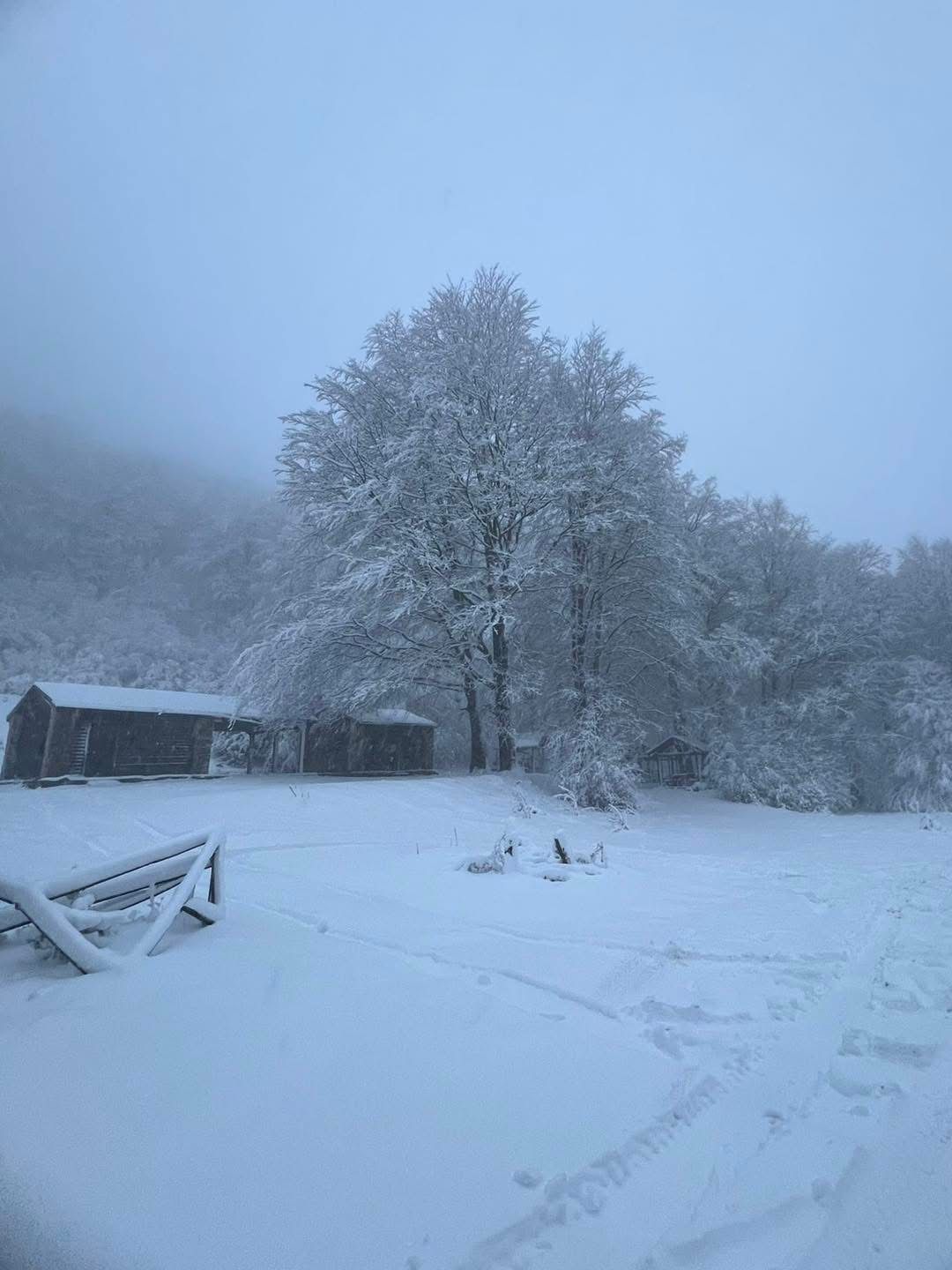 Dalle radure alle strade immerse tra i faggi, ogni angolo è stato avvolto da una coltre bianca che smorza i rumori, leviga i contorni e illumina il bosco con riflessi lattiginosi. Le vecchie casette di legno, i recinti, gli alberi secolari: tutto sembra tornare a un’armonia primordiale, come se il tempo avesse rallentato per lasciare spazio soltanto alla natura.