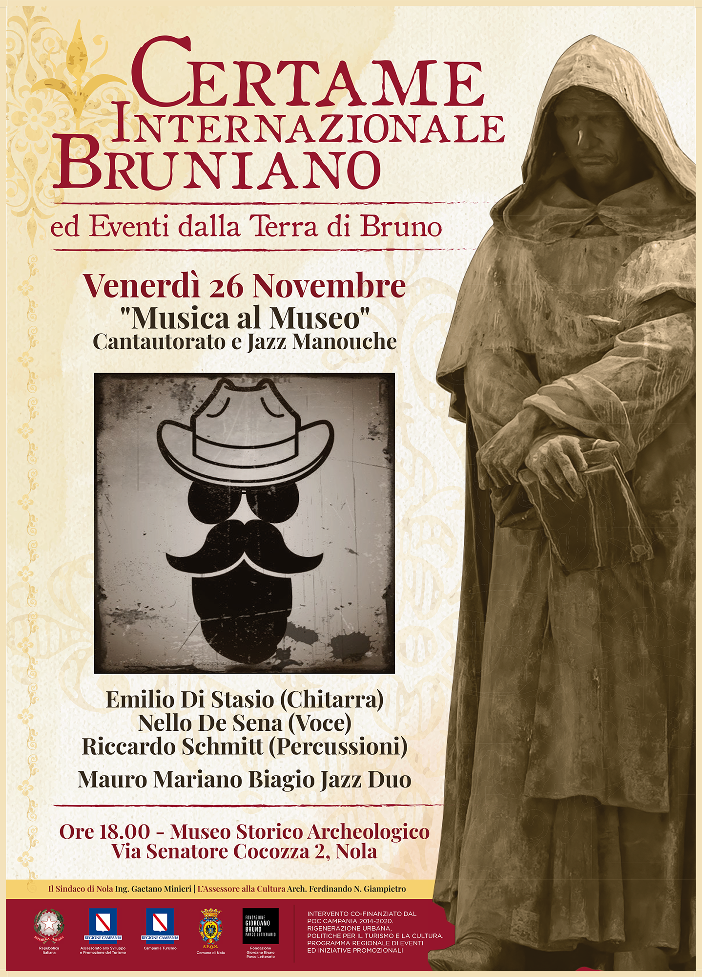 Weekend all’insegna della musica a Nola con le iniziative del progetto “Certame internazionale bruniano” promosso dall’amministrazione comunale guidata dal sindaco Gaetano Minieri con l’assessore alla cultura Ferdinando Giampietro e co-finanziato dal Poc Campania 2014/2020 nell’ambito del programma “Rigenerazione Urbana, Politiche per il Turismo e la Cultura. Programma regionale di eventi ed iniziative promozionali”.