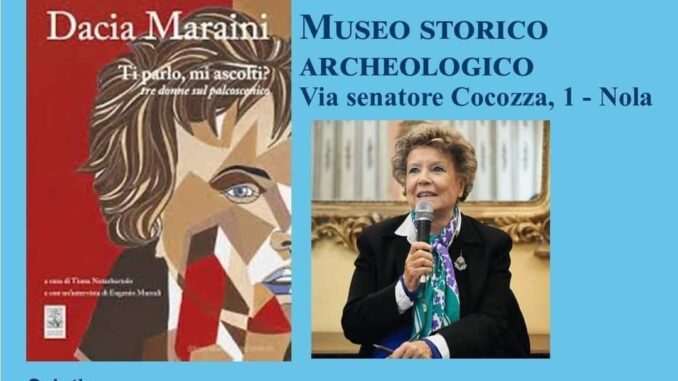 Nola – Un incontro d’autore d’eccezione. E’ quello in programma domenica 8 ottobre alle ore 18.30, presso la Sala Vaccaro del Museo Archeologico di Nola, quando la celebre scrittrice e poetessa Dacia Maraini presenterà il suo libro “Ti parlo, mi ascolti? Tre donne sul palcoscenico”.
