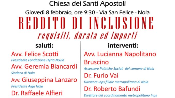 Un seminario sul reddito di inclusione rivolto alle famiglie in difficoltà e di cui l’Inps – filiale metropolitana di Nola – ed i comuni del comprensorio sono i principali interlocutori. L’incontro si terrà alle 9,30 di giovedì 8 febbraio nella chiesa dei Santi Apostoli di Nola.