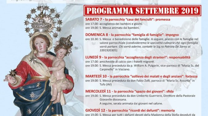 NOLA. Ecco la festa patronale in onore di Maria SS. Della Stella. Il programma 01/09/2019 binews.it ATTUALITA', CULTURA e MANIFESTAZIONI, NOLANO 0 Tutto pronto per la festa patronale presso la Parocchia “Maria SS. Della Stella” di Nola. In allegato il programma completo