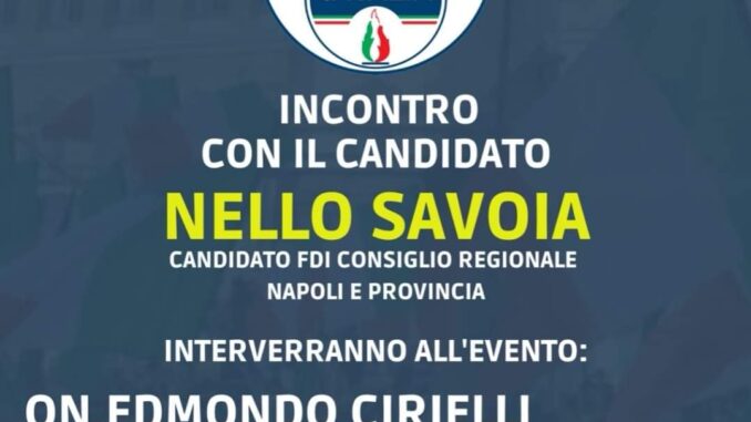 NOLA. Fratelli d’Italia presenta il candidato alle regionali Nello Savoia 07/09/2020 binews.it ATTUALITA', EVIDENZA, NOLANO 0 Giovedì 10 settembre presentazione ufficiale a Nola presso la sala del Mutilato del candidato alle Regionali di Fratelli d’Italia Nello Savoia.