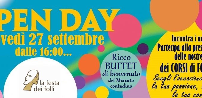 Giovedì 27 settembre dalle 16:00, la festa dei folli apre al territorio con un OPEN DAY e la presentazione dell’offerta formativa, giunta alla sua diciottesima edizione!, del nuovo anno delle attività culturali 2018.19.