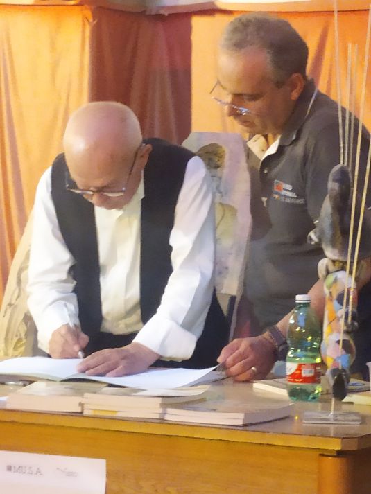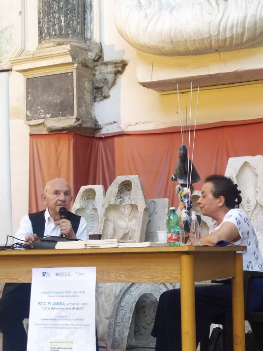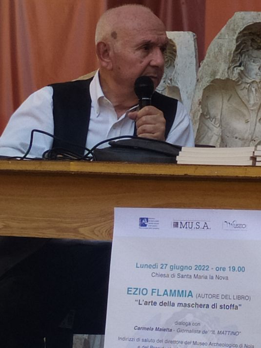 E’ lo sfondo, in cui si è dipanato il dialogo tra Ezio Flammia e Carmela Maietta, giornalista de Il Mattino, con attenzione mirata e dettagliata sulle maschere ludiche, collegate al top delle usanze e consuetudini carnevalesche, in specie del teatro nella Commedia dell’Arte, oltre che sulle maschere connesse ai riti funebri del mondo antico. Un dialogo, per evidenziare il ruolo e il significato dei materiali utilizzati, per confezionare le maschere, frutto di studiata e collaudata lavorazione di cuoio, tessuti, stracci, ceramica, gesso e la cartapesta, il mix di carta e colla. Una cultura di lavoro artigianale e, al contempo, di ri-ciclo e ri-uso degli materiali, che ha nelle maschere di stoffa una delle più interessanti produzioni, con un bel lotto donato da Ezio Flammia, eclettico artista e poliedrico scenografo, alla struttura museale di via Senatore Cocozza.