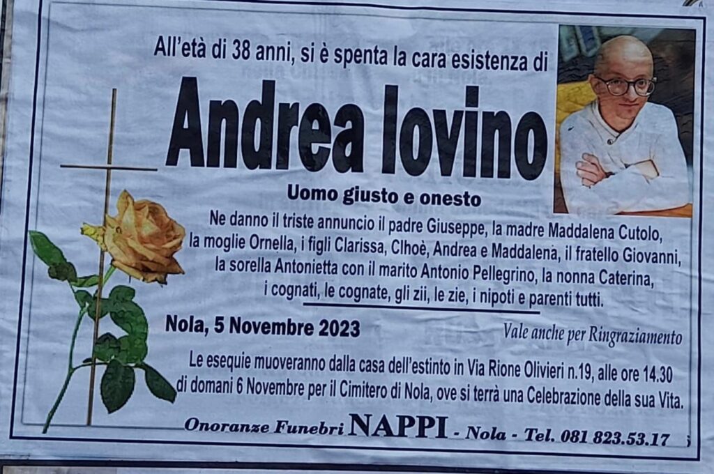 I funerali di Andrea Iovino si terranno domani, 6 novembre, a Nola alle ore 14:30. Sarà tumulato nel cimitero di Nola, dove amici, parenti e colleghi potranno rendere omaggio a questo talentuoso artista e condividere il loro affetto e rispetto per lui.