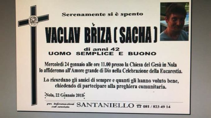 Si terranno mercoledì 24 gennaio alle ore 11 presso la Chiesa del Gesù in Nola i funerali di Vaclav Briza detto Sacha, morto i giorni scorsi presso l’ospedale di Nola dove era ricoverato. L’uomo tristemente conosciuto per l’aggressione subita qualche anno fa presso la stazione ferroviaria di Nola.