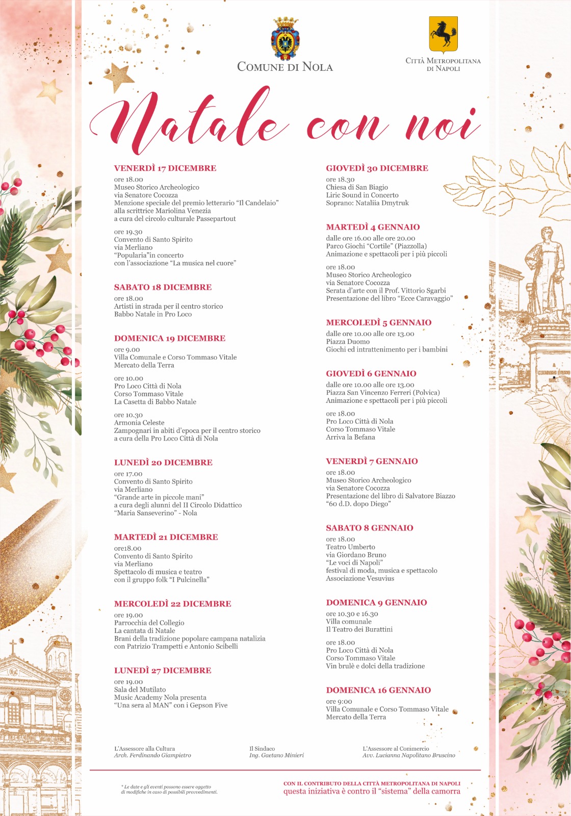 “Un programma a misura di famiglia che, con queste proposte, amplia la progettualità già avviata dal Comune per questo periodo di feste con il progetto finanziato dalla regione Campania ed ispirato al filosofo nolano Giordano Bruno – afferma l’Assessore alla Cultura Ferdinando Giampietro  – un cartellone che guarda alla tradizione con uno sguardo alle radici del Natale e alle melodie che accompagnano questa ricorrenza. Nomi importanti anche nel pamorama culturale come Vittorio Sgarbi, Mariolina Venezia e Salvatore Biazzo che daranno uno slancio letterario al programma”.