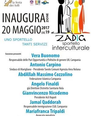 All’inaugurazione dello sportello interculturale ZADIG, sabato 20 maggio alle 19:00, saranno presenti: Vera Buonomo, Responsabile delle Pari Opportunità e delle Politiche di Genere UIL Campania; Antonio Carpino, Sindaco di Marigliano e Presidente del Tavolo dei Sindaci dell’Agenzia Area Nolana; AbdAllah Massimo Cozzolino, Federazione Islamica Campania; Angelo Finaldi, già Direttore Distretto Sanitario Nola; Gianvincenzo Nicodemo, Presidente ACLI Napoli; Jamal Qaddorah, Responsabile Immigrazione CGIL Campania; Mariafranca Tripaldi, Avvocata penalista.