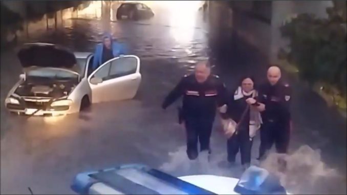 La pioggia del pomeriggio ha causato non pochi problemi alla circolazione delle auto soprattutto nel territorio di Nola dove come di consueto alcuni sotto passi si allagano e sono vere e proprio trappole per gli automobilisti. Stessa cosa è capitata oggi in Via Polveriera a Nola, a causa dello straripamento del torrente circostante l’area il sottopasso si è letteralmente allagato. A farne le spese un uomo e una donna rimasti con l’auto completamente invasa dall’acqua. Ci hanno pensato due Carabinieri della Compagnia di Nola a tirarli fuori senza preoccuparsi di bagnarsi. Dopo qualche minuto i due sono stati riportati all’asciutto ringraziando gli uomini dell’Arma per l’assistenza fornita.