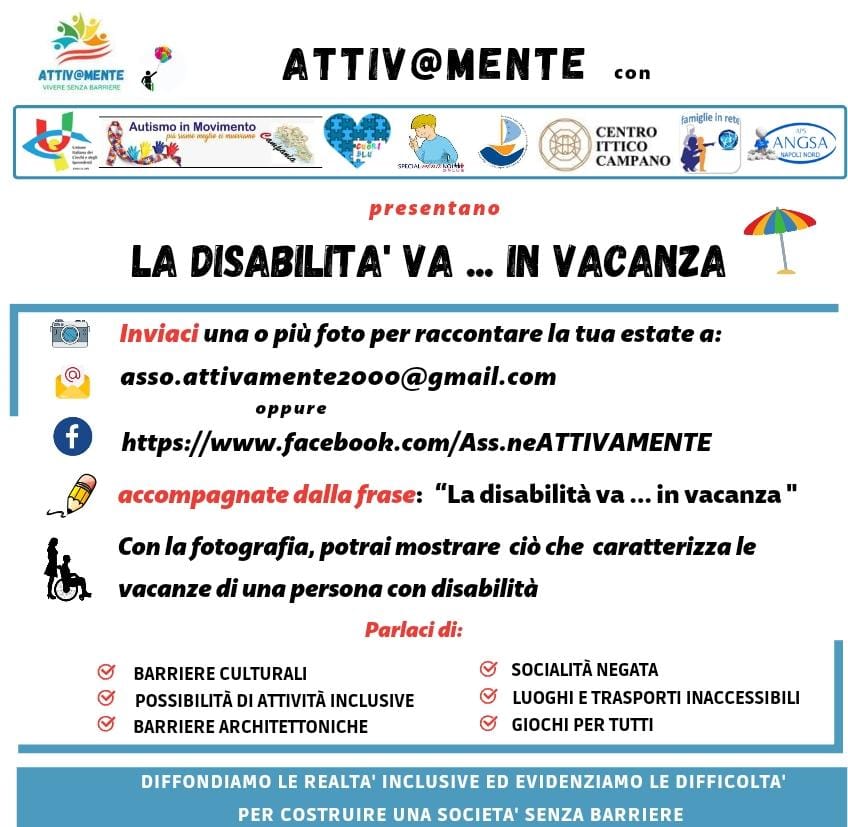 L’Associazione ATTIVAMENTE, con l‘Unione Italiana dei Ciechi e degli Ipovedenti, il movimento Autismo in Movimento, le associazioni Cuori Blu, SPECIALmente NOI ONLUS, APDD, Famiglie in rete, APS ANGSA NAPOLI NORD, il Centro Ittico Campano presentano per l‘estate 2023 il progetto fotografico “La disabilità va … in vacanza”, di cui è responsabile per l’associazione ATTIVAMENTE Carmen Santagata. L‘estate rappresenta un momento durante il quale si evidenziano le differenze tra le persone con disabilità di ogni età e i loro coetanei, in assenza di attività a loro dedicate o a causa delle molte barriere architettoniche, sono costretti in casa. Talvolta, invece, soprattutto grazie alle tante associazioni che si adoperano sui territori o alle azioni messe in opera da Municipalità illuminate, i ragazzi e – in generale – le persone con disabilità possono vivere qualche momento di socialità. La nostra iniziativa rappresenta – quindi – l’occasione per mostrare con una semplice fotografia ciò che – nel bene o nel male – caratterizza le vacanze di una persona con disabilità: dall’accessibilità/inaccessibilità dei luoghi di interesse turistico e dei mezzi di trasporto alla presenza di attività e giochi inclusivi, dalle barriere architettoniche e culturali motivo di socialità negata e della solitudine delle persone con disabilità alla possibilità di attività inclusive, ai giochi per tutti, ai momenti di allegria e spensieratezza delle famiglie con disabilità. Scopo dell’iniziativa è, dunque, quello di unirci tutti nel tentativo di costruire un mondo senza barriere, diffondendo le realtà inclusive presenti sui territori ed evidenziandone le difficoltà. L’invito è aperto a tutti, perché’ l’inclusione non è e non può essere solo un impegno delle famiglie con disabilità.