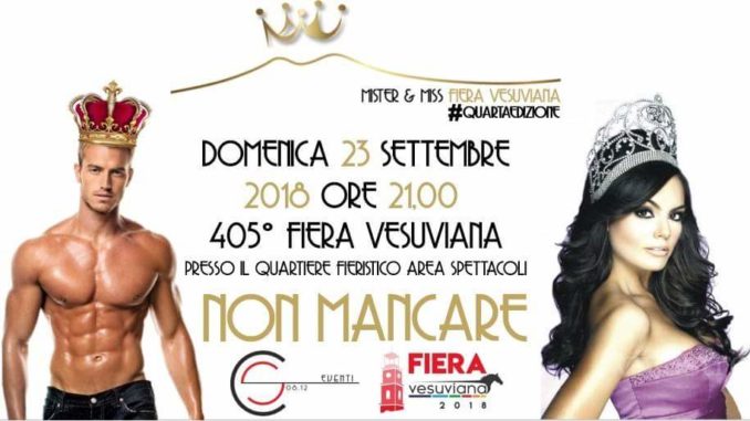 Ritorna domenica 23 settembre, alle ore 20, il concorso “Mr e Miss Fiera Vesuviana” organizzato da Agostino Stellini e Carmen Ciniglio, quest’ultima sarà anche la presentatrice della serata. Tre le fasce in palio : Mr e Miss Fiera Vesuviana, Miss e Mister Eleganza, Miss e Mister Televoto. L’appuntamento ormai annuale richiama sempre migliaia di spettatori e anche quest’anno l’attesa è grande.