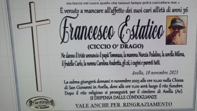 Ne danno il triste annuncio il papà Tommaso, la mamma Nunzia Pedalino, la sorella Milena, il fratello Carlo, la nonna Carolina Andretta, gli zii, i cugini e parenti tutti. La salma giungerà domani sabato 11 novembre alle ore 10 nella chiesa di San Giovanni in Avella dove alle ore 11 avrà luogo il rito funebre. Dopo il rito religioso si proseguirà per il Cimitero di Avella.