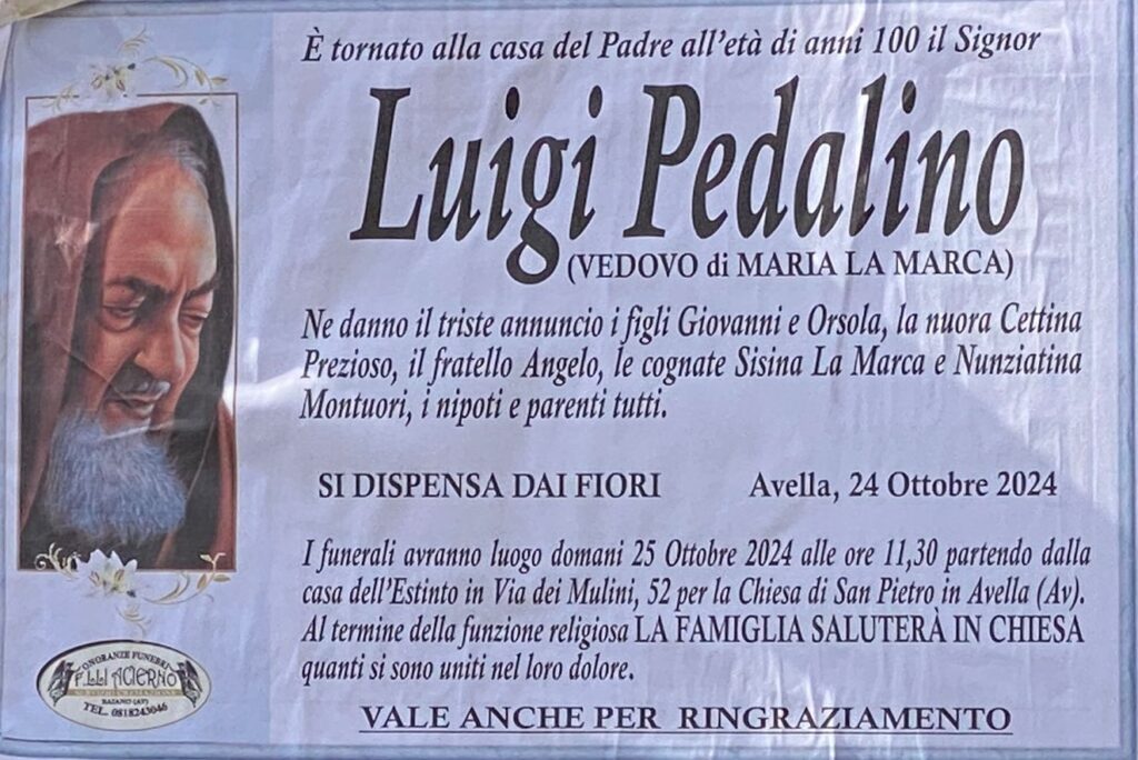 Il 24 ottobre 2024, ad Avella, è venuto a mancare all’età di 100 anni Luigi Pedalino, vedovo di Maria La Marca. A darne il triste annuncio sono i figli Giovanni e Orsola, la nuora Cettina Prezioso, il fratello Angelo, le cognate Sisina La Marca e Nunziatina Montuori, i nipoti e i parenti tutti.