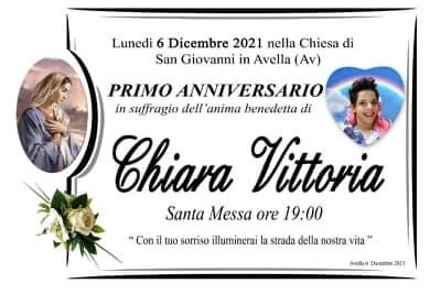 NON È PIÙ. Avella, Santa Messa in Suffragio di Chiara Vittoria 05/12/2021 binews.it ATTUALITA', NON E' PIU' 0 Lunedì 6 dicembre 2021 nella Chiesa di San Giovanni in Avella alle ore 19 sarà celebrata una Santa Messa, nel primo anniversario della morte, in suffragio dell’anima benedetta di Chiara Vittoria.