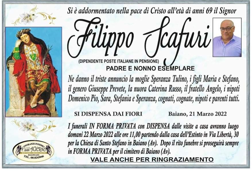 Ne danno il triste annuncio la moglie Speranza Tulino, i figli Maria e Stefano, il genero Giuseppe Prevete, la nuora Caterina Russo, il fratello Angelo, i nipoti Domenico Pio, Sarà, Stefania e Speranza, i cognati, le cognate, i nipoti e parenti tutti. I funerali in forma strettamente privata con dispensa dalle visite a casa avranno luogo domani 22 marzo alle ore 11 partendo dalla casa dell’Estinto in via Libertà, 30 per la Chiesa di Santo Stefano in Baiano (AV). Dopo il rito religioso si proseguirà sempre in forma strettamente privata per il Cimitero di Baiano.