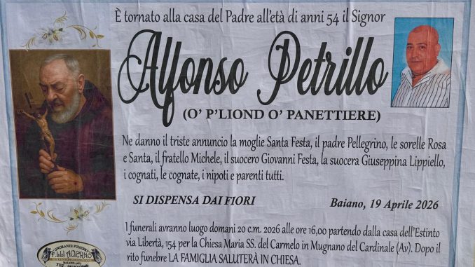 Mugnano del Cardinale piange la scomparsa di Alfonso Petrillo, venuto a mancare all’età di 54 anni. Una notizia che ha colpito profondamente la comunità, dove era conosciuto e stimato da tutti.