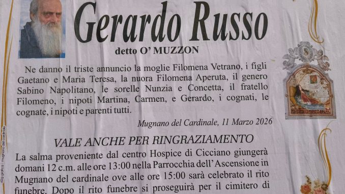 MUGNANO DEL CARDINALE — La comunità di Mugnano del Cardinale piange la scomparsa di Gerardo Russo, conosciuto da tutti come “’O Muzzon”, venuto a mancare all’età di 75 anni.