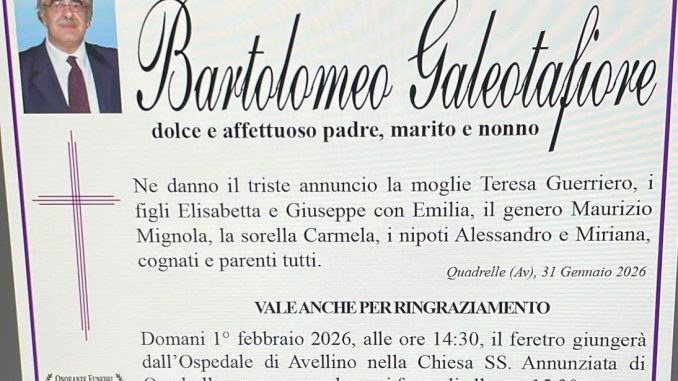 I funerali si svolgeranno domani, 1° febbraio 2026. Il feretro giungerà alle ore 14:30 dall’Ospedale di Avellino presso la Chiesa della Santissima Annunziata di Quadrelle, dove alle ore 15:30 sarà celebrato il rito funebre. Al termine della cerimonia religiosa, la famiglia saluterà il caro Bartolomeo al cimitero di Quadrelle.