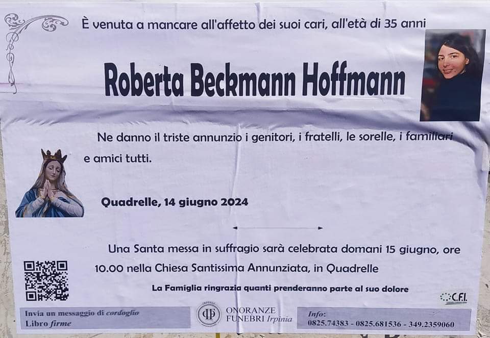 Ne danno il triste annuncio i genitori, i fratelli e le sorelle i familiari e amici tutti. Una Santa Messa in suffragio è stata celebrata oggi alle ore 10 nella Chiesa Santissima Annunziata in Quadrelle. La famiglia ringrazia tutti quelli che hanno preso parte alla cerimonia funebre.