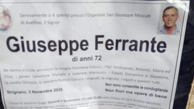 Ne danno il triste annuncio la moglie Filomena Colucci, i figli Ferdinando, Antonio, Maria ed Elisa, i fratelli Domenico e Giovanni, la sorella Olimpia, la suocera Nunzia Colucci, i cognati, le cognate, i nipoti e parenti tutti. I funerali avranno luogo Giovedì 5 Novembrealle ore 11 nella chiesa di Sant’Andrea Apostolo.