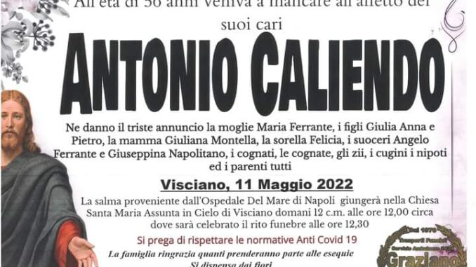 Ne danno il triste annuncio la moglie Maria Ferrante, i figli Giulia Anna e Pietro, la mamma Giuliana Montella, la sorella Felicia, i suoceri Angelo Ferrante e Giuseppina Napolitano, i cognati, le cognate, gli zii, i cugini i nipoti ed i parenti tutti. La salma proveniente dall’Ospedale del Mare di Napoli giungerà nella chiesa di Santa Maria Assunta in Visciano domani 12 maggio alle ore 12 circa, il rito funebre sarà celebrato alle ore 12,30.