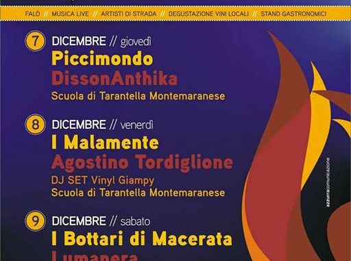 Insieme ai falò, la cui accensione avverrà giovedì 7 dicembre alle ore 18 – le vie del centro si riscalderanno con gli spettacoli itineranti della Scuola di Tarantella Montemaranese e la musica folkloristica proposta in due punti spettacolo distinti: Piccimondi e DissonAnthika in programma giovedì 7 dicembre; i Malamente, Agostino Tordiglione e, a seguire, DJ-Set Vinyl Giampy in programma venerdì 8 dicembre; i Bottari di Macerata Campania, i Lumanera, Irish Monaghan e, a seguire, DJ-Set Nello Ferrara e Mario Carbone in programma sabato 9 dicembre.