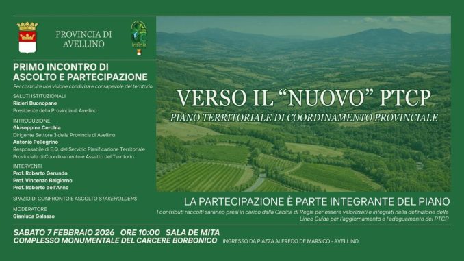 Primo incontro di ascolto e partecipazione per la redazione del nuovo Ptcp – Piano territoriale di coordinamento provinciale – domani – sabato 7 febbraio – alle ore 10.00, presso la Sala De Mita del Complesso Monumentale Carcere Borbonico di Avellino.