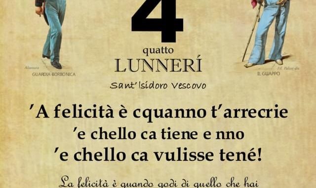 ‘O PRUVERBIO D’ ‘O JUORNO. Lunedì 4 aprile 2022 04/04/2022 binews.it ATTUALITA', EVIDENZA, Il Proverbio del Giorno 0 di Gianni Polverino’A felicità è cquanno t’arrecrie ’e chello ca tiene e nno ’e chello ca vulisse tené! La felicità è quando godi di quello che hai e no di quello che vorresti avere.