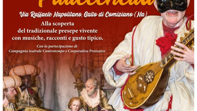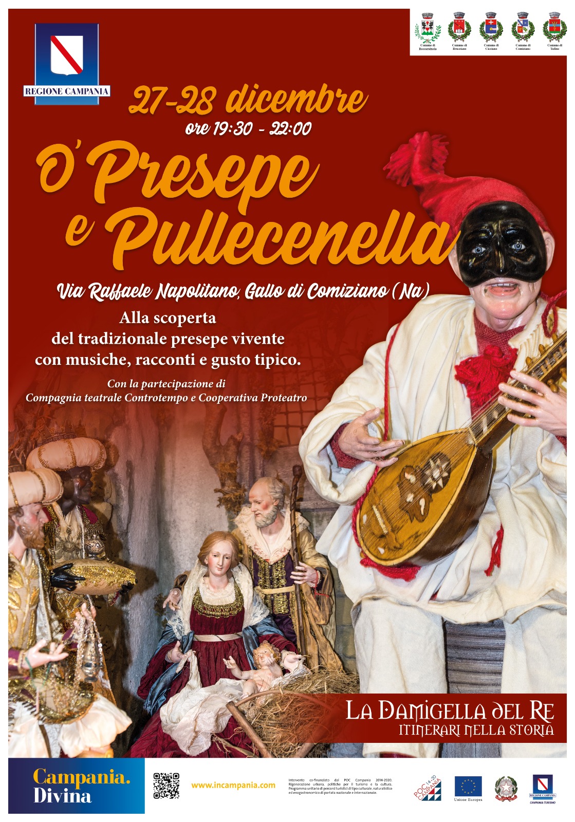 La frazione Gallo del Comune di Comiziano (NA) si prepara ad ospitare una nuova edizione de “O’ Presepe e Pullecenella”, il tradizionale presepe vivente, animato dalla comunità locale, divenuto un appuntamento fisso delle festività natalizie nel territorio dell’Agro-Nolano. L’evento avrà luogo, presso Via Raffaele Napolitano, nei giorni 27 e 28 dicembre e sarà caratterizzato da un percorso di visita guidata teatralizzata, cui sarà possibile accedere, in entrambi i giorni, dalle ore 19,30 alle 22,00, con accessi contingentati. Il percorso di visita si articolerà in diverse tappe che rappresenteranno, oltre alla tradizionale natività e situazioni tipiche del presepe napoletano, anche scene tipiche della cultura partenopea. Alcune di esse, oltre ad essere animate da musica e da figuranti in costume che accoglieranno i visitatori, vedranno la partecipazione della Compagnia teatrale Controtempo e Coopertaiva Proteatro, che sapranno meglio ancora caratterizzare le ambientazioni del presepe. Lungo il percorso sarà possibile anche degustare alcuni prodotti tipici della tradizione locale. Quello di Gallo di Comiziano non è, dunque, un presepe muto, statico e compassato, bensì un presepe animato, dinamico e avvincente, ambientato nell’Ottocento con tutti i colori, i suoni, le voci, gli attrezzi, i personaggi dell’epoca e della tradizione napoletana. Tale presepe prende vita attraverso un allestimento che coinvolge i portoni e cortili della frazione Gallo e un adattamento teatrale che attinge sia da testi sacri che profani della tradizione napoletana, da cui sono estratti poesie, filastrocche, canti e balli, mirabilmente arrangiate, modificate e adattate nonché magistralmente interpretate dai tanti e tanti “attori”, grandi e piccoli, che, negli anni, hanno partecipato a questa manifestazione, che vede la fattiva collaborazione di attori e comparse locali amatoriali e non. L’iniziativa è inserita nell’ambito del progetto “La Damigella del Re – Itinerari nella storia”, ed è co-finanziata dal POC Campania 2014-2020 – Rigenerazione Urbana, politiche per il turismo e la cultura. Programma unitario di percorsi turistici di tipo culturale, naturalistico ed enogastronomico di portata nazionale e internazionale.