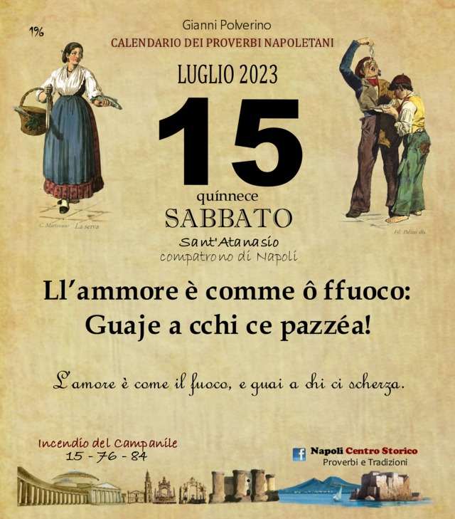 ‘O PRUVERBIO D’ ‘O JUORNO. 15/07/2023 binews.it ATTUALITA', EVIDENZA, Il Proverbio del Giorno 0 di Gianni Polverino Ll’ammore è comme ô ffuoco: Guaje a cchi ce pazzéa! L’amore è come il fuoco, e guai a chi ci scherza.