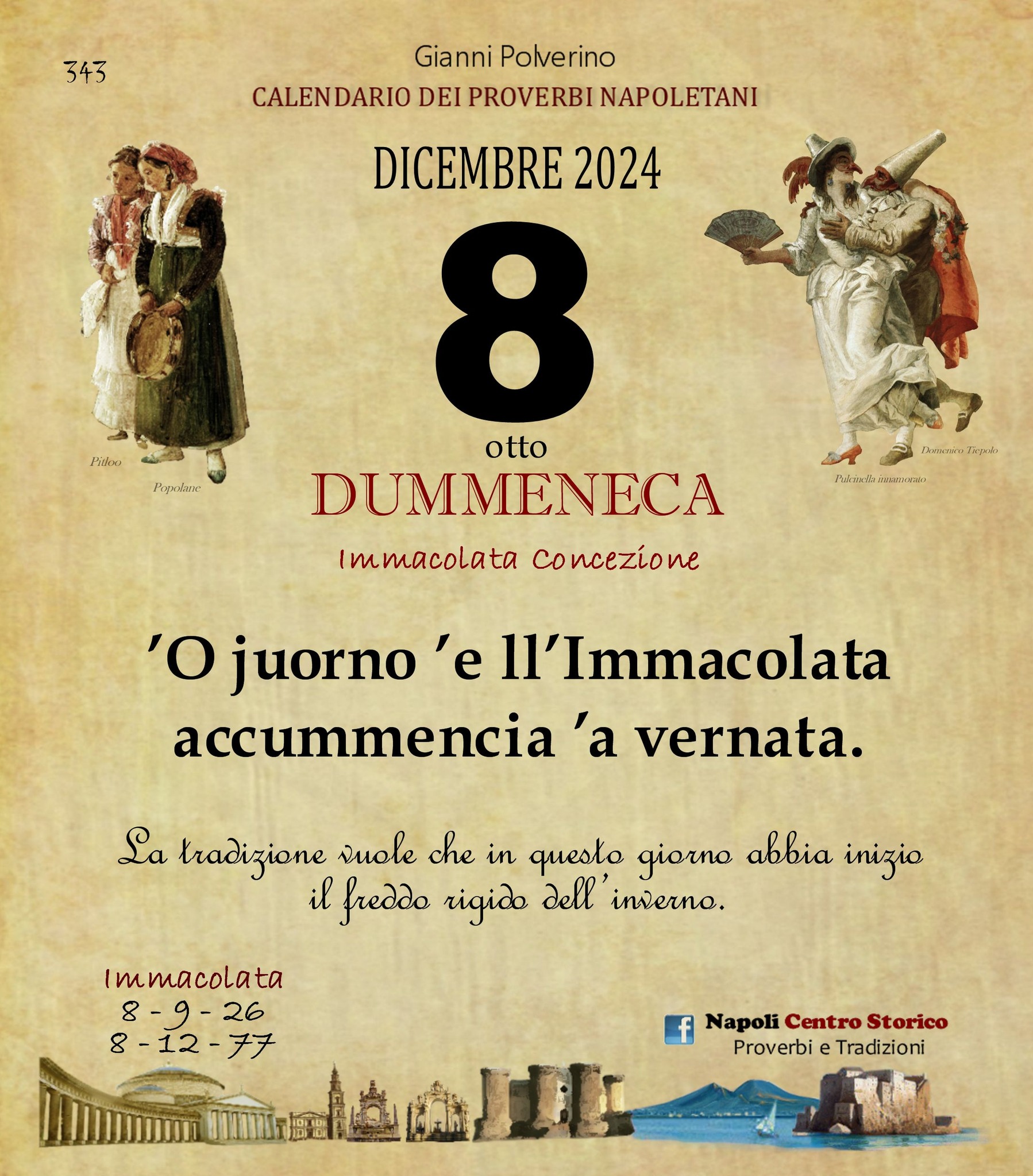 ‘O PRUVERBIO D’ ‘O JUORNO- Domemica 8 dicembre 2024 08/12/2024 binews.it ATTUALITA', EVIDENZA, Il Proverbio del Giorno 0 di Gianni Polverino’O juorno ’e ll’Immacolata accummencia ’a vernata.La tradizione vuole che in questo giorno abbia inizio il freddo rigido dell’inverno.