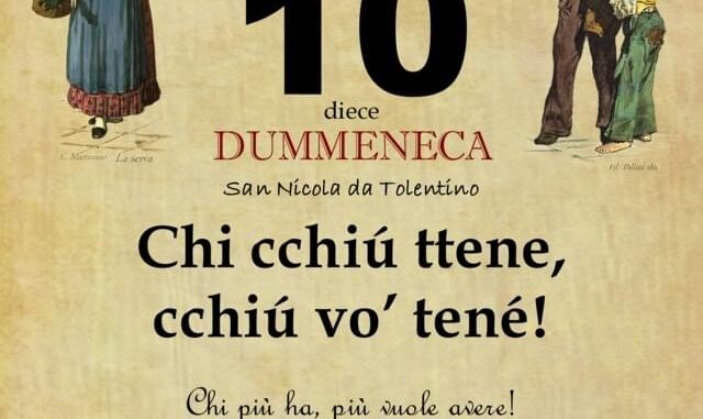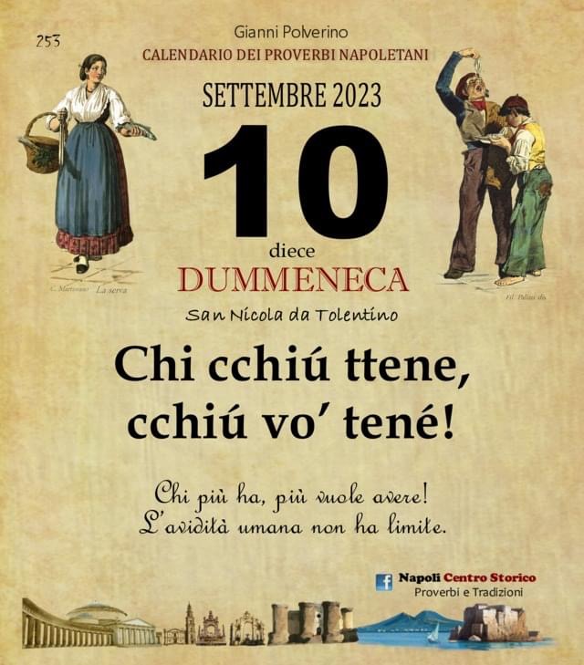 ‘O PRUVERBIO D’ ‘O JUORNO. Domenica 10 settembre 2023 10/09/2023 binews.it ATTUALITA', EVIDENZA, Il Proverbio del Giorno 0 di Gianni Polverino Chi cchiú ttene, cchiú vo’ tené! Chi più ha, più vuole avere! L’avidità umana non ha limite.