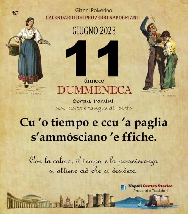 ‘O PRUVERBIO D’ ‘O JUORNO. Domenica 11 giugno 2023 11/06/2023 binews.it ATTUALITA', EVIDENZA, Il Proverbio del Giorno 0 di Gianni Polverino Cu ’o tiempo e ccu ’a paglia s’ammósciano ’e ffiche. Con la calma, il tempo e la perseveranza si ottiene ciò che si desidera.