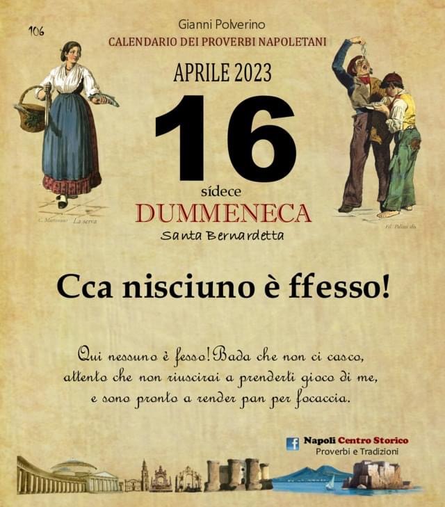 ‘O PRUVERBIO D’ ‘O JUORNO. Domenica 16 aprile 2023 16/04/2023 binews.it ATTUALITA', EVIDENZA, Il Proverbio del Giorno 0 di Gianni Polverino Cca nisciuno è ffesso! Qui nessuno è fesso! Bada che non ci casco, attento che non riuscirai a prenderti gioco di me, e sono pronto a render pan per focaccia.
