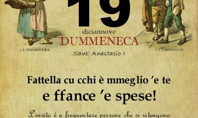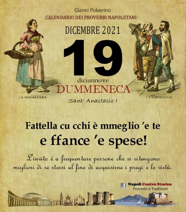 ‘O PRUVERBIO D’ ‘O JUORNO. Domenica 19 dicembre 2021 19/12/2021 binews.it ATTUALITA', EVIDENZA, Il Proverbio del Giorno 0 di Gianni PolverinoFattella cu cchi è mmeglio ’e te e ffance ’e spese! L’invito è a frequentare persone che si ritengono migliori di se stessi al fine di acquisirne i pregi e le virtù.