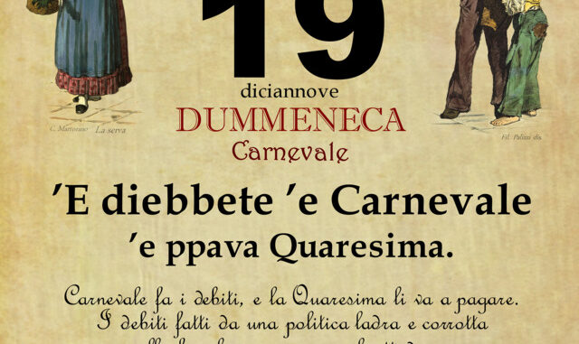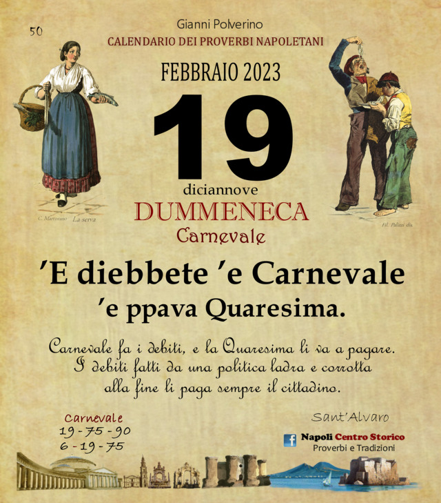 ‘O PRUVERBIO D’ ‘O JUORNO. Domenica 19 febbraio 2023 19/02/2023 binews.it ATTUALITA', EVIDENZA, Il Proverbio del Giorno 0 di Gianni Polverino ’E diebbete ’e Carnevale ’e ppava Quaresima. Carnevale fa i debiti, e la Quaresima li va a pagare. I debiti fatti da una politica ladra e corrotta alla fine li paga sempre il cittadino.