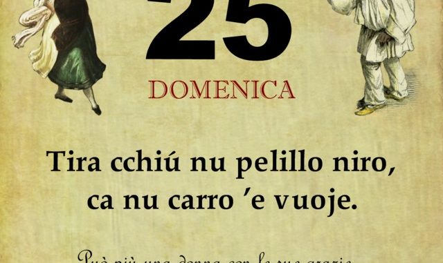 ‘O PRUVERBIO D’ ‘O JUORNO. Domenica 25 agosto 2019 25/08/2019 binews.it ATTUALITA', EVIDENZA, Il Proverbio del Giorno 0 di Gianni Polverino Tira cchiú nu pelillo niro, ca nu carro ’e vuoje. Può più una donna con le sue grazie… che un carro di buoi.