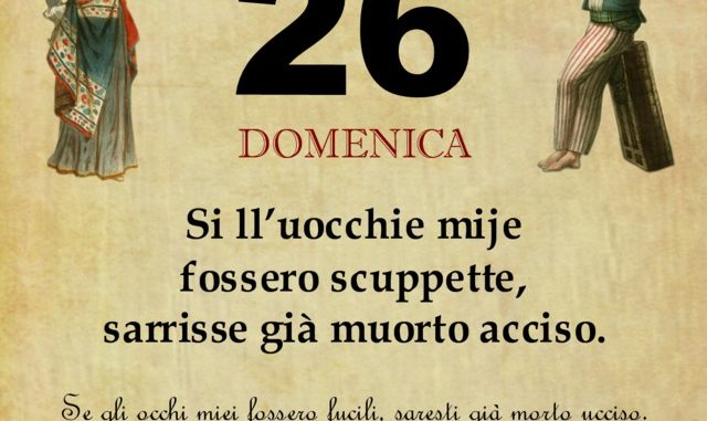 ‘O PRUVERBIO D’ ‘O JUORNO. Domenica 26 aprile 2020 26/04/2020 binews.it ATTUALITA', EVIDENZA, Il Proverbio del Giorno 0 di Gianni Polverino Si ll’uocchie mije fossero scuppette, sarrisse già muorto acciso. Se gli occhi miei fossero fucili, saresti già morto ucciso.