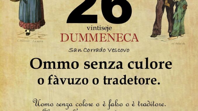 ‘O PRUVERBIO D’ ‘O JUORNO. Domenica 26 novembre 2023 26/11/2023 binews.it ATTUALITA', EVIDENZA, Il Proverbio del Giorno 0 di Gianni Polverino Ommo senza culore, o fàvuzo o tradetore. Uomo senza colore o è falso o è traditore. Il viso e l’espressione di una persona sono lo specchio dei suoi sentimenti.