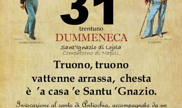 ‘O PRUVERBIO D’ ‘O JUORNO. Domenica 31 luglio 2022 31/07/2022 binews.it ATTUALITA', EVIDENZA, Il Proverbio del Giorno 0 di Gianni PolverinoTruono, truono vattenne arrassa, chesta è ’a casa ’e Santu ’Gnazio.Invocazione al santo di Antiochia, accompagnato da un campanellino, per allontanare lampi e tuoni.