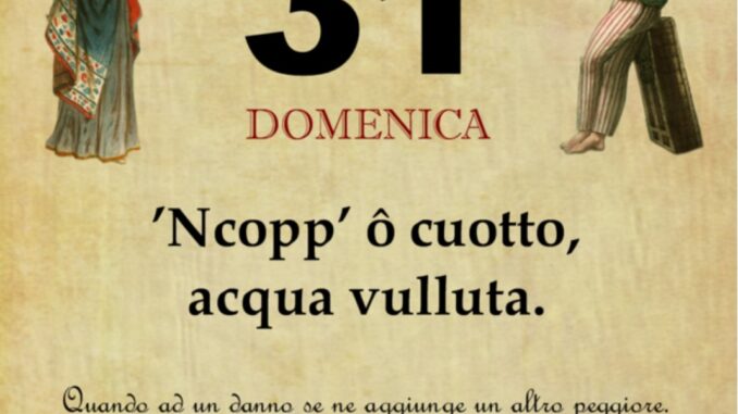 ‘O PRUVERBIO D’ ‘O JUORNO. Domenica 31 maggio 2020 31/05/2020 binews.it ATTUALITA', EVIDENZA, Il Proverbio del Giorno, SANT'Oggi 0 di Gianni Polverino ’Ncopp’ ô ccuotto, acqua vulluta. Quando ad un danno se ne aggiunge un altro peggiore.