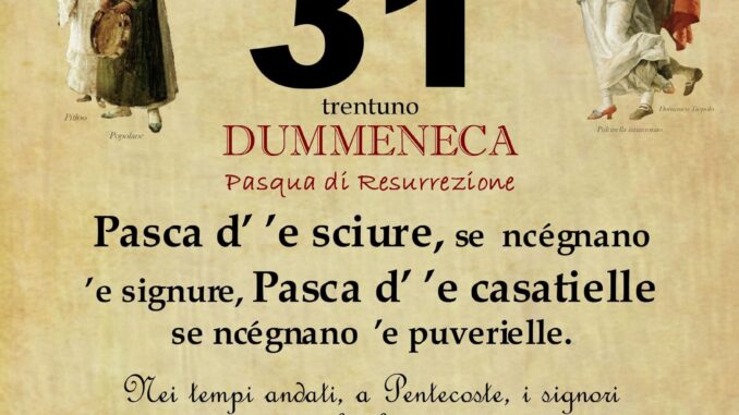 ‘O PRUVERBIO D’ ‘O JUORNO. Domenica 31 marzo 2024 31/03/2024 binews.it ATTUALITA', EVIDENZA, Il Proverbio del Giorno 0 di Gianni Polverino Pasca d’ ’e sciure, se ncégnano ’e signure, Pasca d’ ’e casatielle se ncégnano ’e puverielle. Nei tempi andati, a Pentecoste, i signori indossavano gli abiti nuovi mentre a Pasqua lo facevano i più poveri.