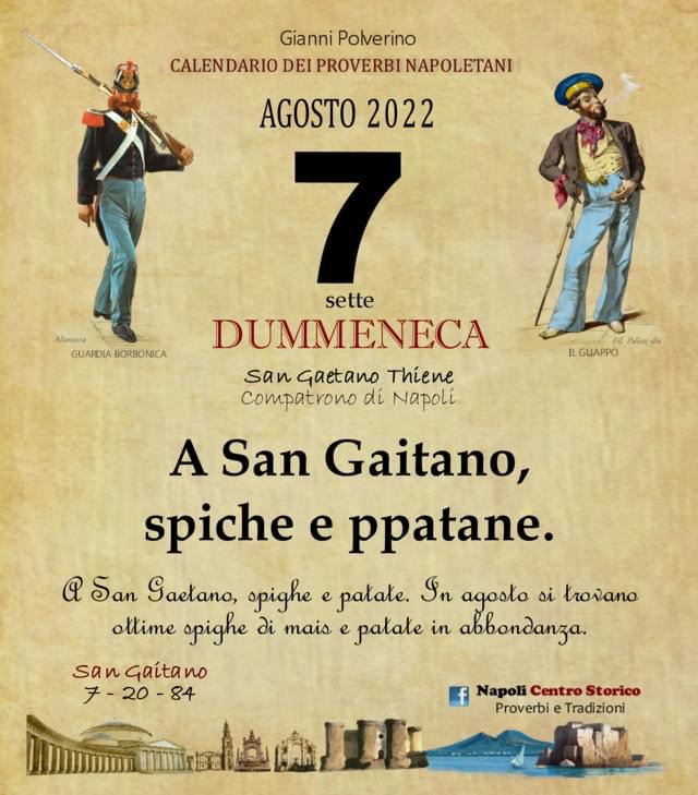 ‘O PRUVERBIO D’ ‘O JUORNO. Domenica 7 agosto 2022 07/08/2022 binews.it ATTUALITA', EVIDENZA, Il Proverbio del Giorno 0 di Gianni Polverino A San Gaitano, spiche e ppatane. A San Gaetano, spighe e patate. In agosto si trovano ottime spighe di mais e patate in abbondanza.